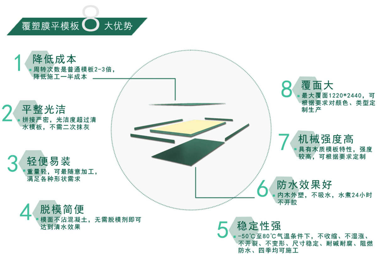 自主研發(fā)生產(chǎn)綠色環(huán)保覆塑膜(PP)平模板